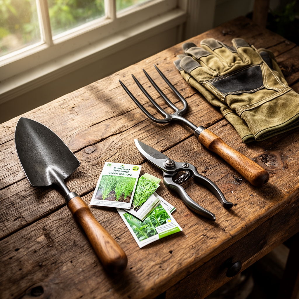 Legume green manure supplies 80-150 pounds of nitrogen per acre. Test soil after decomposition; add phosphorus or potassium only if deficiencies appear. Rock phosphate (0-3-0) and greensand (0-0-3) supplement without excess soluble salts.