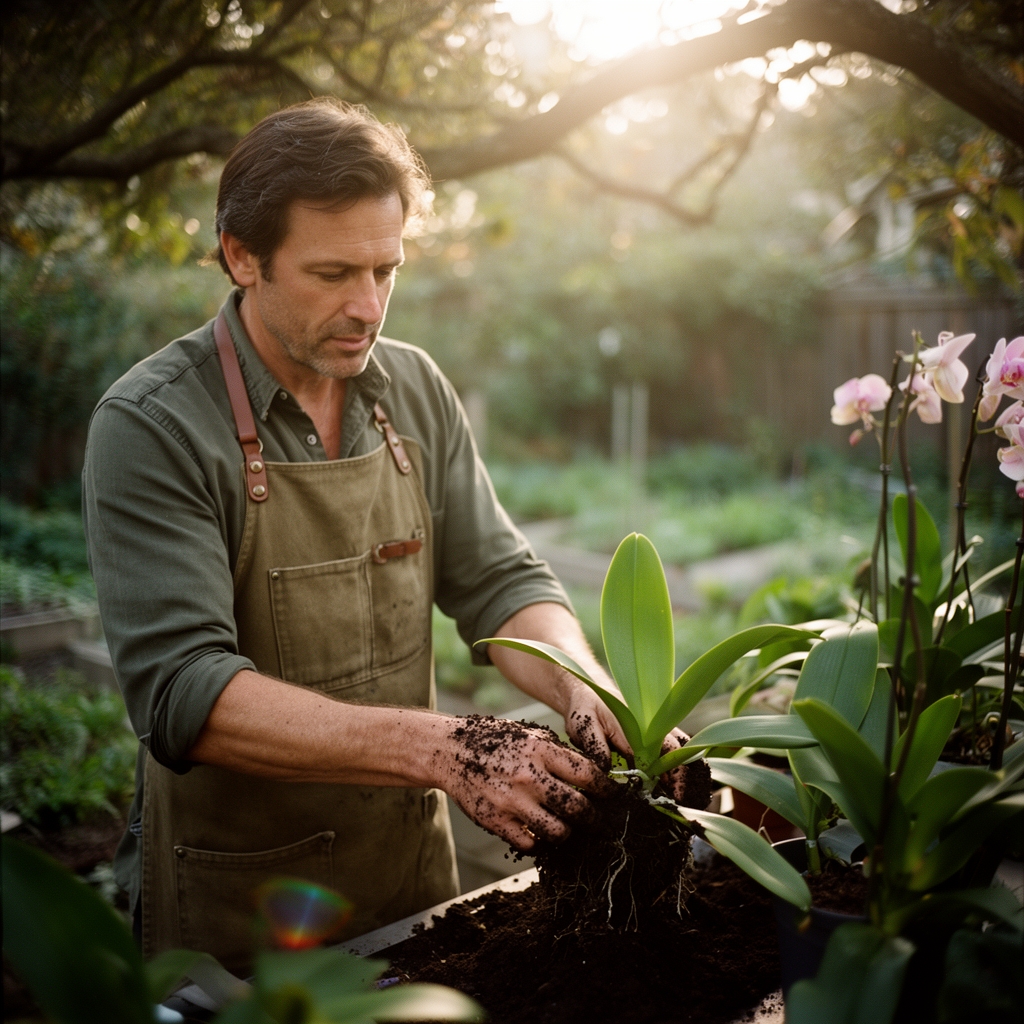 Position orchids with new growth facing the light source. Pseudobulbs should sit at media surface level, not buried. Pack bark loosely around roots; compression reduces oxygen availability. Secure tall plants with rhizome clips attached to pot edges.